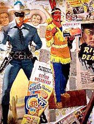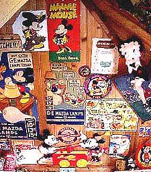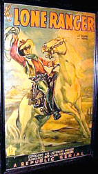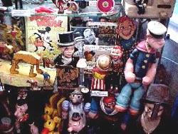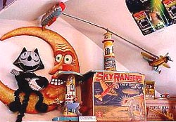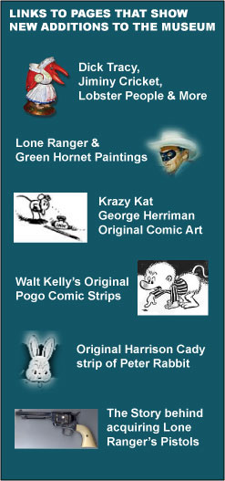 The Toy Museum has two floors of display and it will take about one hour see much of the collection. Big Little Books and comic books, rare 1930s Popeye & Jeep toys, and original Disney Fantasia animation art are shown. There is a 1937 Hazelle's marionette Thimble Theatre stage with Popeye, Olive Oyl and Wimpy. You will see a life size Yoda and original Star Wars figures, including all the rare versions. We have the Lionel World War II, 1942 paper toy train, mint in-the-box. Also, beautiful Krazy Kat, Pogo and Snoopy original newspaper art and animation cels are on display. The Museum has one of the largest collection of Lone Ranger toys, including comics and the original Lone Ranger paintings from WXYZ ratio station. On the right is Clayton Moore's Lone Ranger Shirt that has been recently added to the collection. |