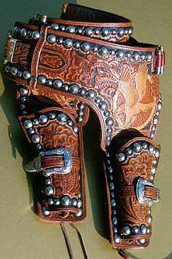 ![]() Above is Buscadero Colt Peacemaker quick-draw Gun Rig, of classic 1940s & 50s Hollywood Western Movie design. Leatherwork as an art form. Hand tooled by master craftsman, Tony Downe. A similar Tony Downe rig is exhibited at the Gene Autry Western Museum in Los Angeles. The intricate foliate and Eagle hand carving is complimented by extensive use of top quality traditional German silver fittings. This is leather craftsmanship of the highest standard. A truly unique work of art. |